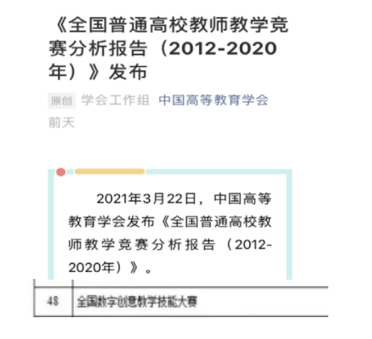 全国数字创意教学技能大赛已获得中国高等教育学会关注,并成功入选2021年全国普通高校教师教学竞赛榜单。大赛成功入选教育部中国高等教育学会《全国普通高校教师教学竞赛分析报告》,在教师技能大赛领域获得广泛影响力。