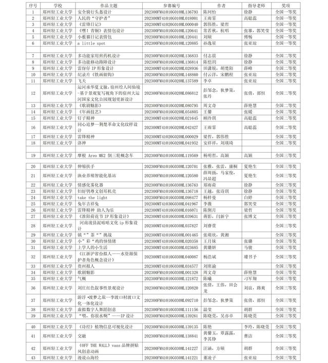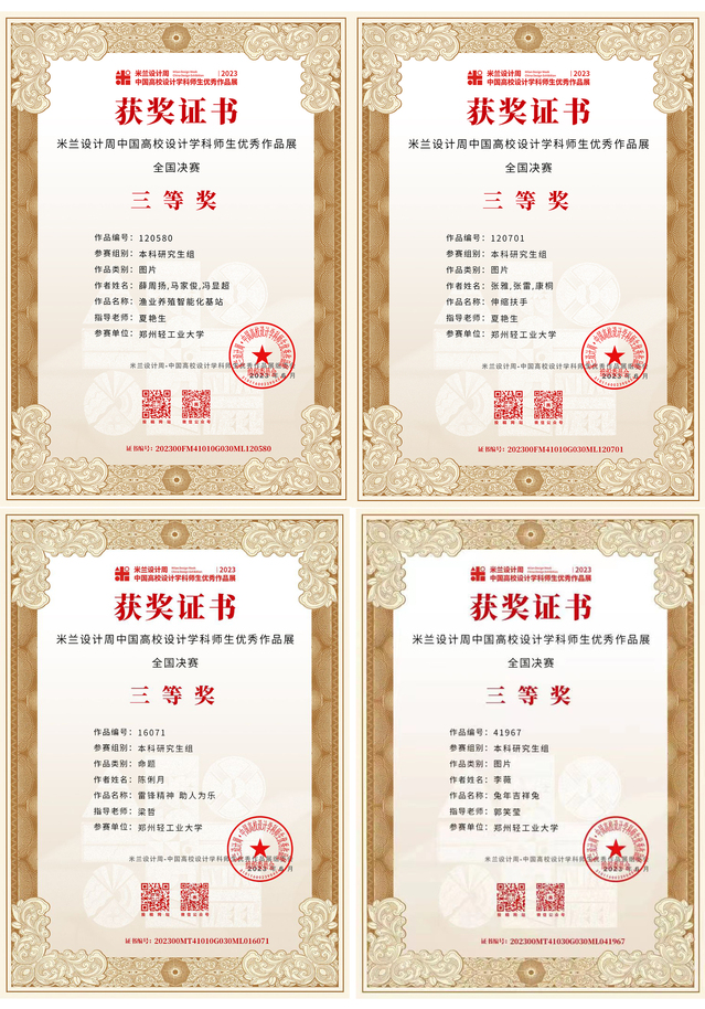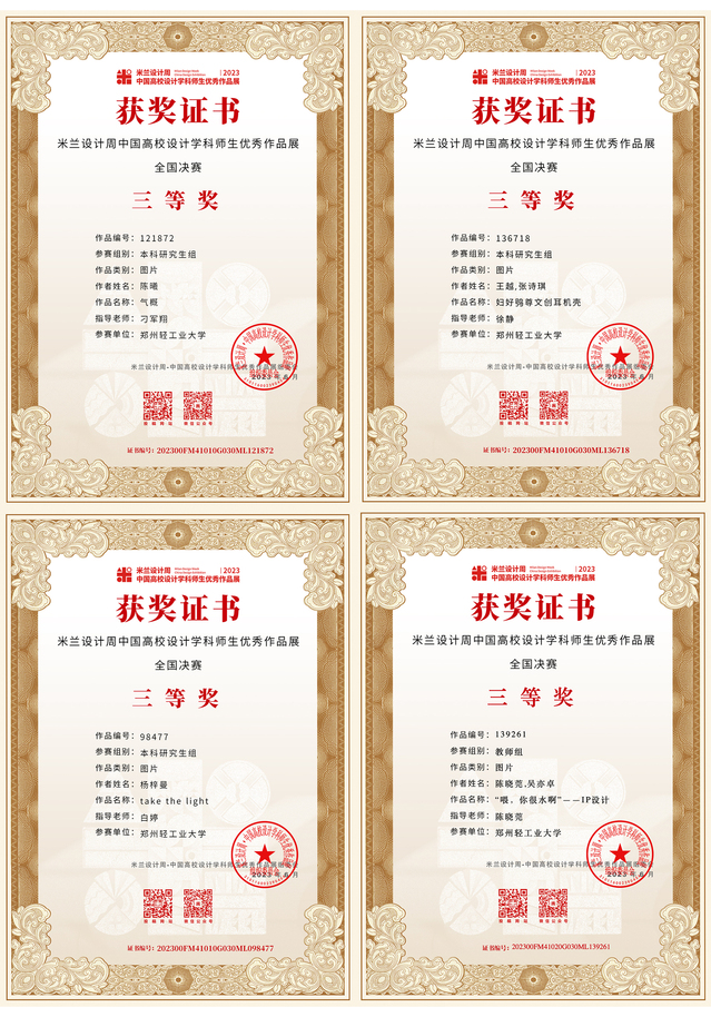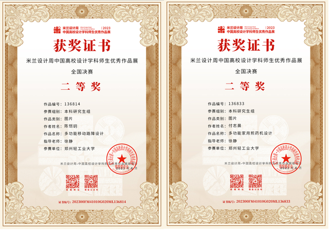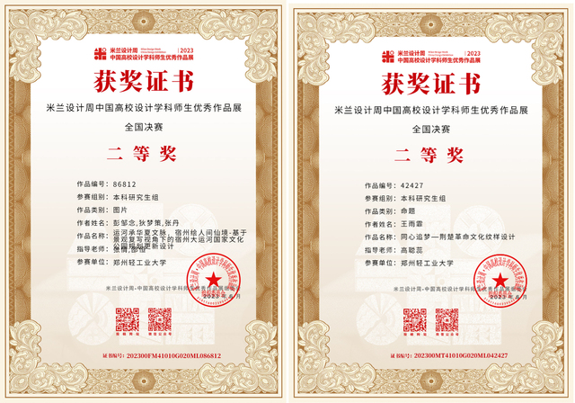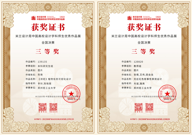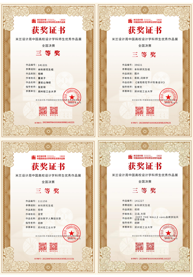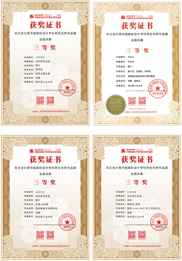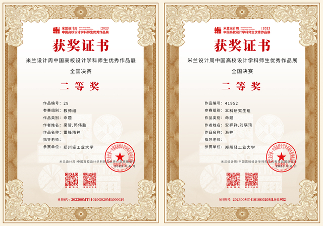 “2023第七届米兰设计周·中国高校设计学科师生优秀作品展”经数月的省赛评审、国赛评审、获奖信息公布及公示,获奖证书现已下发。黄色网站 师生在本次大赛的全国赛区、河南省赛区中斩获佳绩,其中全国赛区获奖43项:一等奖6项,二等奖12项,三等奖25项;河南省赛区获奖81项:一等奖27项,二等奖24项,三等奖30项,进一步提升了黄色网站 在全国设计学科领域的知名度和影响力。