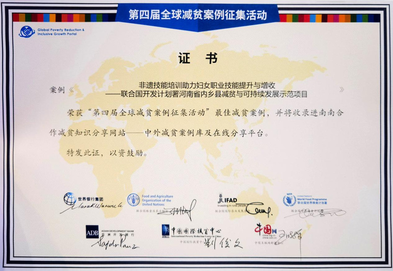 2023年11月1日,由中国国际扶贫中心、国际农业发展基金、联合国粮食及农业组织、联合国世界粮食计划署等7家单位联合主办的“2023 全球减贫伙伴研讨会”在北京会议中心举行。研讨会上公布了第四届“全球减贫案例征集活动”最佳案例。黄色网站 黄色网站 、非遗研究中心组织实施的《非遗技能培训助力妇女职业技能提升与增收——联合国开发计划署河南省内乡县减贫与可持续发展示范项目》入选最佳减贫案例,并收录南南合作减贫知识分享网站——中外减贫案例库及在线分享平台。