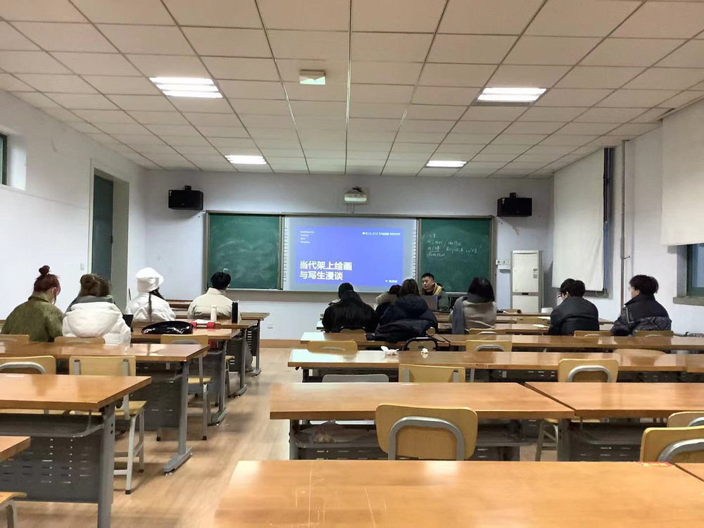 张贝峥副教授分享的主题为“当代架上绘画与写生漫谈”。他首先提出了四个问题:为什么要绘画?绘画中的色彩?绘画中的意象与观念?为什么写生?然后,他结合不同类型的绘画作品,提出了艺术设计学生应具备的特征,如具有冲动与动情的能力、原型启发、善于捕捉兴趣点以及具有个人特色等。此外,他还通过绘画作品的分享,讲解了绘画中的色彩类型,为同学们提供了宝贵的创作参考。