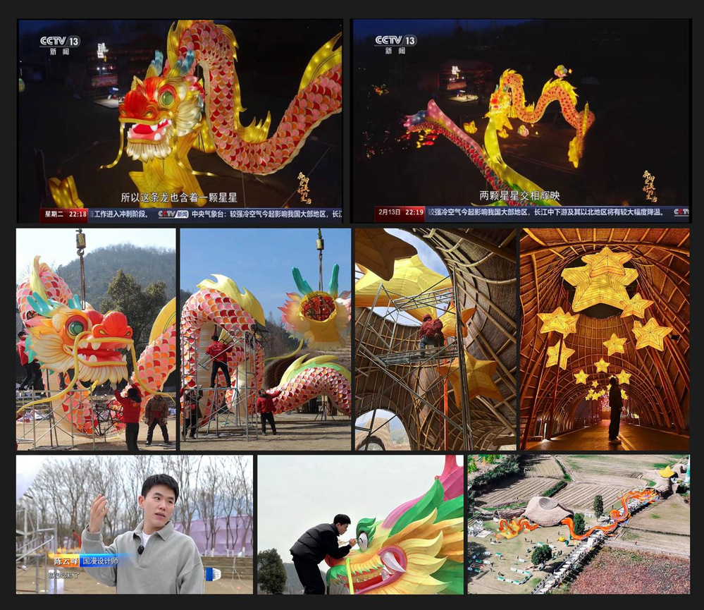 (2)2024年2月受邀担任国际绿色乡村“‘两山’理论发源地”中国余村青年灯会策划及主设计师,联合上美影共同打造十一组原创国漫龙灯,全程被央视记录,央视《新闻联播》播出并报道。
