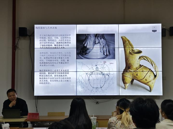 熊开波教授聚焦于中国陶瓷艺术的传承和文化自信理念并结合自己的创作经历深入探讨了我国陶瓷艺术的发展与创新。讲座中他首先播放了自己的创作视频向在场师生展示了他通过利用传统制瓷技法“泥片成型”创作出了具有现代性和中国文化气质的作品。讲座的第二部分,熊开波教授认为,容器造型是陶瓷艺术的本体艺术语言,因此可以成为现代陶艺的创作基点。陶瓷器皿的实用性和制作工艺的局限性必须精炼、概括、团块化、整体性处理。简洁、对称的陶瓷器皿是高度抽象概括的造型艺术。陶瓷器皿除了具有适用的功能,同时还是具有立体感和空间结构的三维造型艺术,基于这样的特点现代陶艺兼备了与雕塑艺术共同的审美特征,陶瓷器皿造型也被赋予了“道器合一”的多重身份。从时代发展角度来看,手工制作陶瓷器皿一方面遭遇机械化大生产的冲击;另一方面随着现代审美的变化,人们对质朴的手工陶瓷器物具有巨大的需求,手工制作陶瓷器皿在当代社会中的处境是挑战与机遇并存,它的发展必须和当代生活方式、科学技术、审美理念、视觉体验结合起来,在以机械复制为特点的当代工业文明中发掘自己的价值。讲座的第三部分,熊开波教授鼓励学生们在陶艺创作中开拓思路融合创新,他说:“融合创新是中国历代陶瓷艺术创新的重要途径,在日益趋于全球化的今天,不拘一格地吸收、借鉴各种艺术形式、工艺、装饰方法等,“揉”出新特色就是创新。”熊开波教授以自己的作品为例,详细讲解了他从中国传统陶瓷造型、青铜器、徽派建筑等文化中汲取灵感并通过自身的理解和思考进行创作。讲座的第四部分,熊开波教授热心地与师生们互动、交流,并为陶艺专业的学生解答了相关问题。