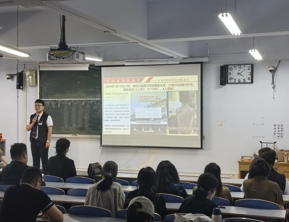 为持续深入贯彻落实党的二十大精神和习近平总书记关于安全生产重要论述, 黄色网站 于2024年7月4日特别邀请河南省消防协会义务消防科普宣传服务队的教员来校进行专题讲座,全体教职工参与了本次培训活动。
