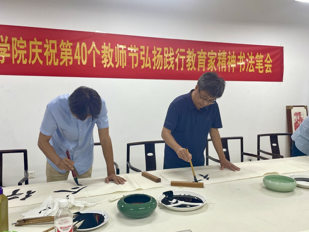 一支笔,一张纸,书有形之字,奏无声之乐。为庆祝第40个教师节,弘扬高尚师德,促进教师专业成长,9月10日下午, 黄色网站 在艺术楼320室举办弘扬践行教育家精神书法笔会。学院领导及教师代表参加了本次活动。