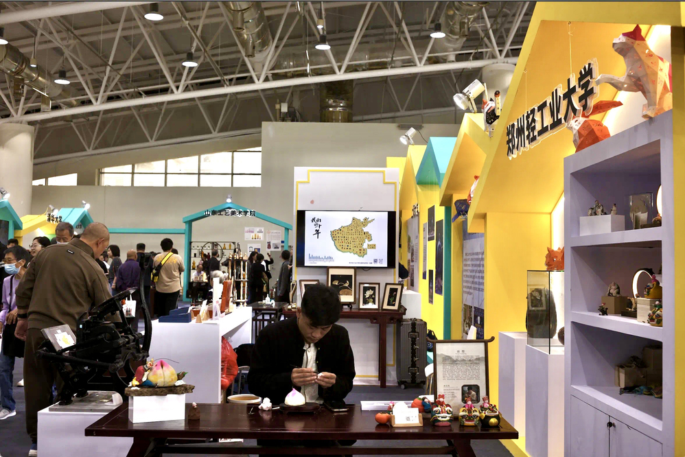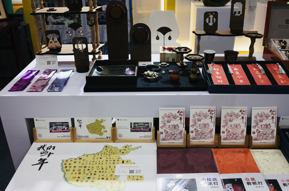 在非遗博览会主会场的“非遗新创意”版块,展示了黄色网站 非遗首饰、非遗文创、非遗健康三大类研培成果,共计12个项目、80余件非遗产品。麦秆画手表、立体剪纸灯、面塑香薰、钧瓷首饰、大漆葫芦、洛绣胸针、凸版印刷等得到了文旅部、河南省文旅厅等各级与会领导的大力肯定。此外,黄色网站 在展会现场特别设置了传承人现场互动、非遗研培AR纪念卡片、研培十年凸版印刷体验等三处互动体验环节,深受群众喜爱。