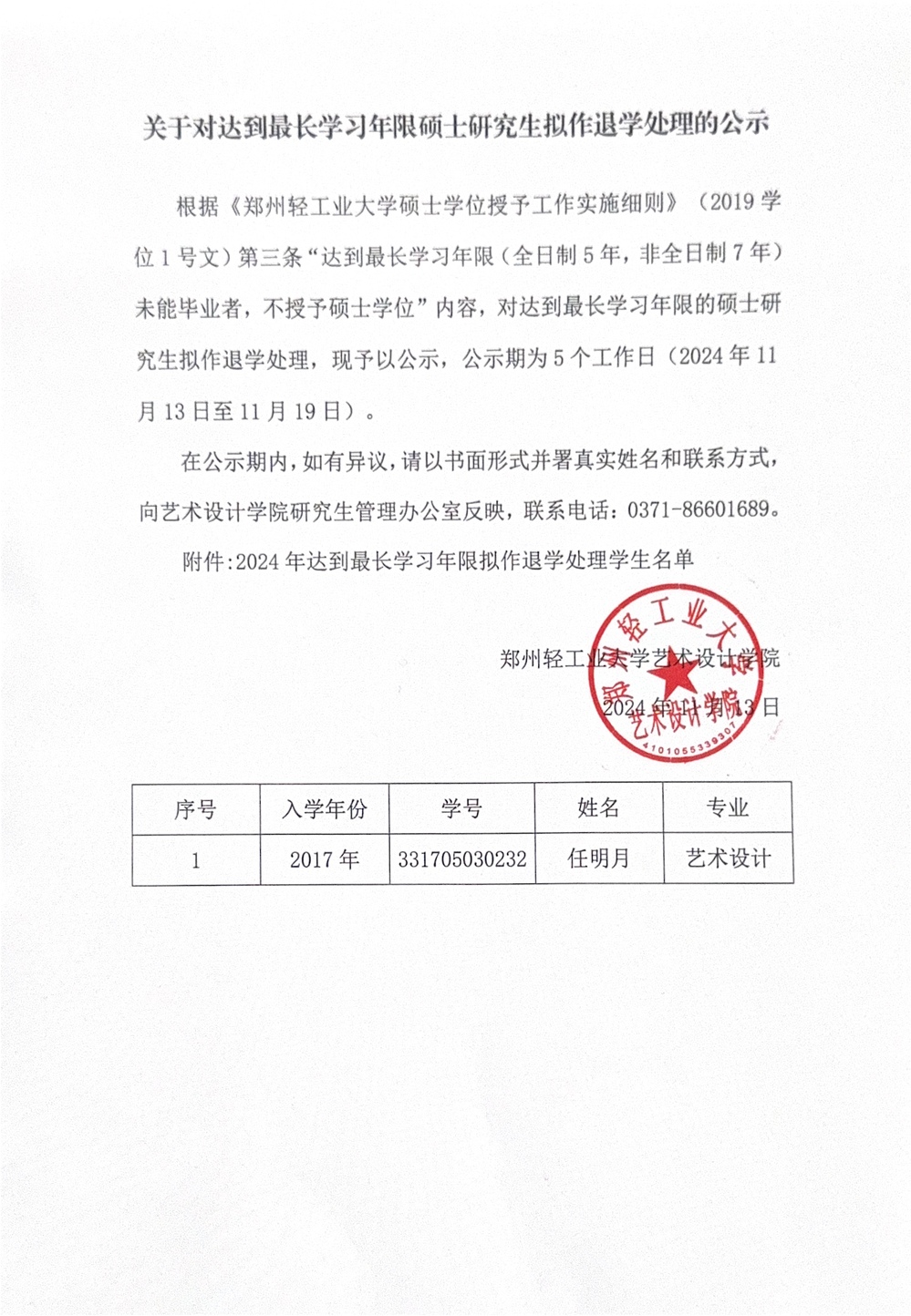 关于对达到最长学习年限硕士研究生拟作退学处理的公示