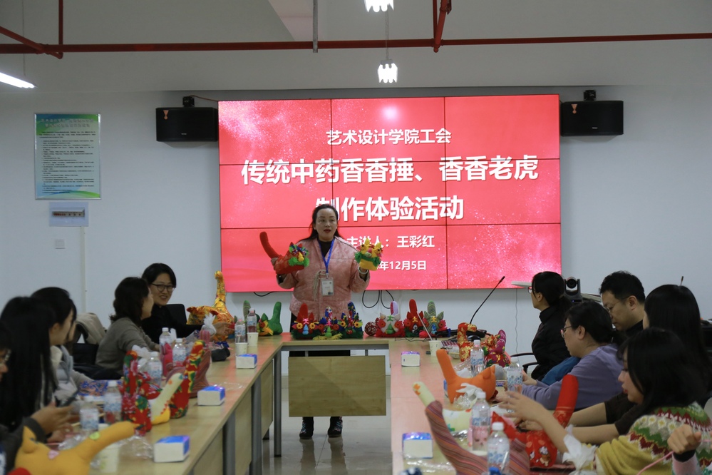 工会在艺术大楼318举办传统中药香香捶、香香老虎制作体验活动。本次活动邀请了中国民间文艺家协会会员、河南女红工艺代表人王彩红为主讲嘉宾,学院40余名教职工参加了本次活动。