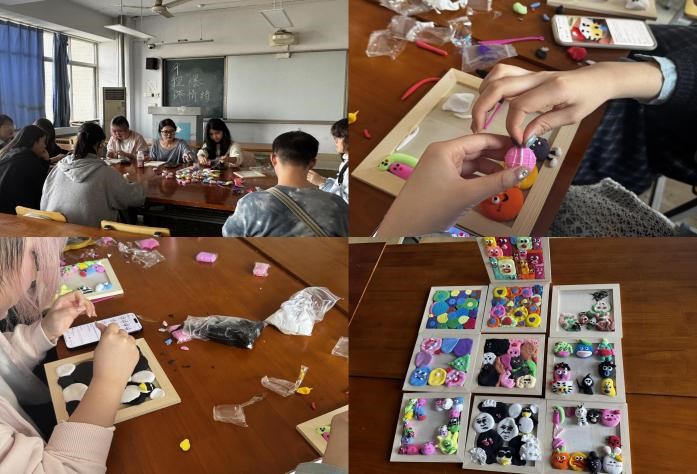 11月9日,设计学类2024-12班于教三710教室成功开展了一场主题为“捏爆坏情绪!DIY多巴胺小怪兽”的创意心理活动。本次活动旨在帮助同学们将无形的负面情绪实体化并进行释放。流程分为情绪吐槽、黏土怪兽创作与互动解压等多个环节。在创作中,同学们将黏土铺展于桌面,尽情发挥想象力,把内心的压力与烦恼具象为形态各异的“小怪兽”。有的作品以黑白色调勾勒“压力细节”,有的则运用亮黄、粉紫等高饱和度的“多巴胺色彩”形成强烈视觉对比。完成创作后,活动进入了别开生面的“解压”阶段——同学们在平板屏幕上将各自的黏土作品反复揉捏、压扁,伴随着轻松的笑声,积压的焦虑也仿佛在此过程中得到有效释放。