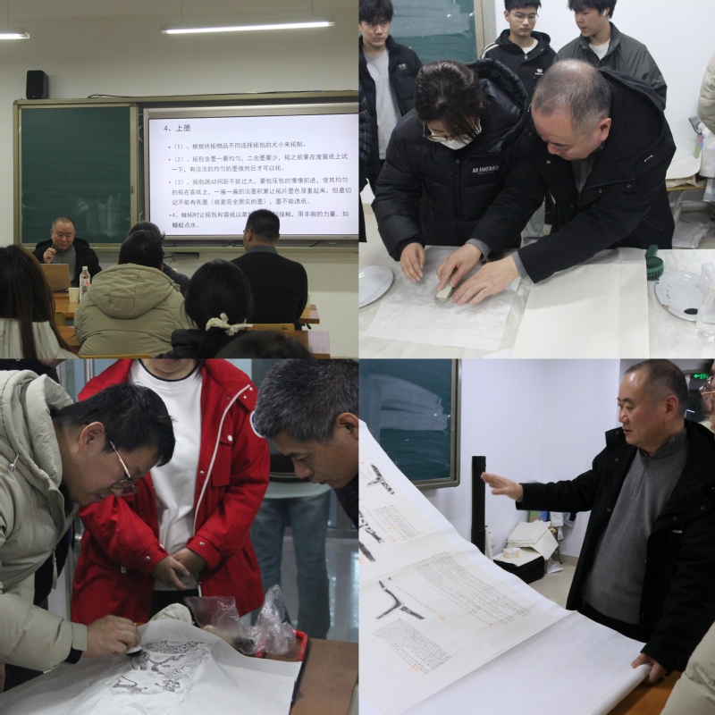 活动中,王秋人老师通过理论讲解与实践指导相结合的方式,系统介绍传拓的历史与技艺,从工具选用、纸张处理到拓印技法逐步解析。在实践环节,同学们在王老师指导下亲手体验铺纸、喷水、敲拓、揭纸等步骤,同学们踊跃参与,现场气氛热烈。体验结束后,师生共同欣赏了王秋人老师的代表作品,进一步领略传统技艺的审美内涵与艺术价值。
