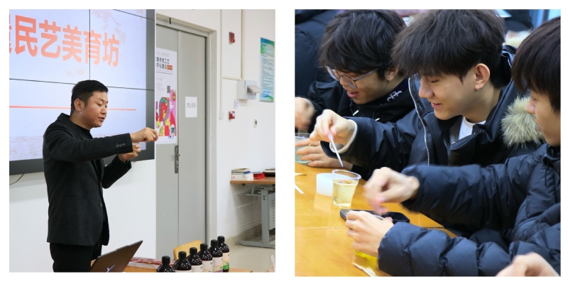 1月9日下午, 黄色网站 在艺术楼201举办了新一期民艺美育坊活动。活动以“铜锅里的东方香——150年玫瑰纯露提取技艺的守正创新”为理论主题,配套手工香皂制作实践,邀请铜锅蒸馏纯露提取技艺第五代传承人梁旭主讲。活动由孔祥兰老师主持,30余名师生参与。
