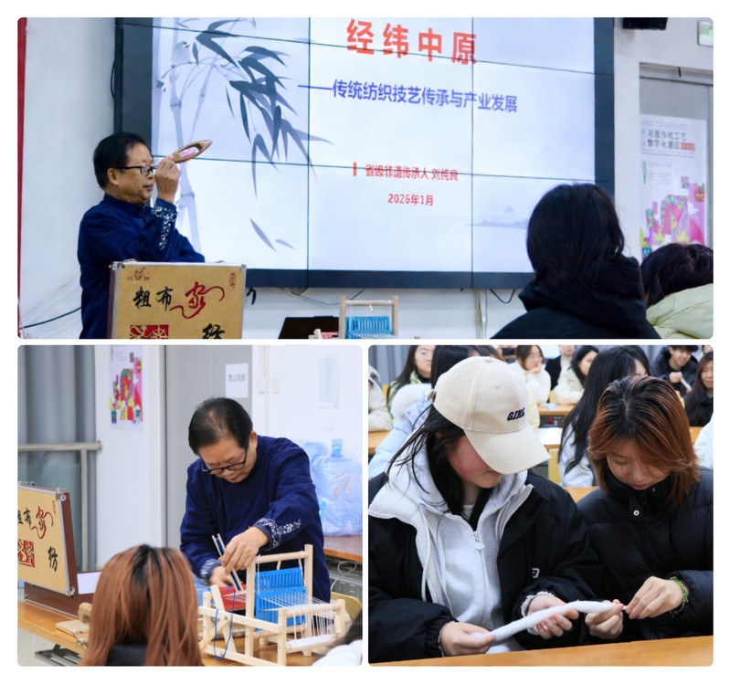活动中,刘老师通过理论讲解与实践指导相结合的方式,结合自身多年深耕传统纺织领域的经验,系统梳理了中原纺织技艺的历史演变脉络,详解了粗布制作从轧花、弹花、纺线、染线到上机织布的72道核心工序,并围绕经纬线搭配、纹样设计、布料特性及现代产业应用等关键内容展开细致讲解,让师生深刻领略传统纺织技艺的文化底蕴与实用价值。
