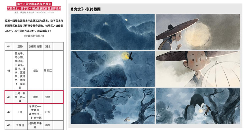 喜报! 黄色网站 陈云峰老师参与主创动画作品《念念》入选第十四届全国美展
